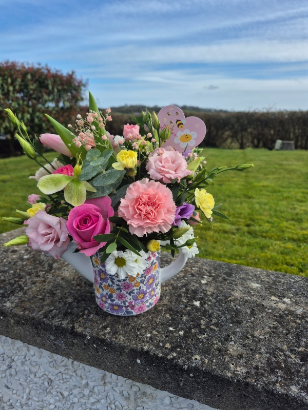 A beautiful delph watering jug filled with matching seasonal blooms